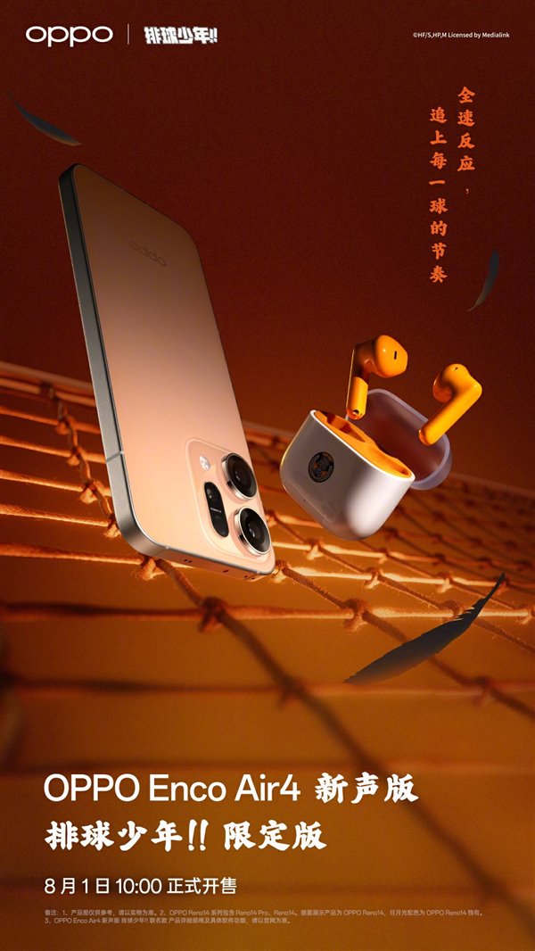 新品将于8月1日上市发售,出厂默认颜色是月光银,支持IP66、搭配OPPO ProXDR显示与小红书HDR实况分享功能以及微信朋友圈Live图分享功能,包括OPPO Enco Air4新声版排球少年联名款、上述新品会在8月1日同步开售。Reno14系列排球少年联名款的主机是日月光配色,一键生成4K高清实况照片,用户可从拍摄好的4K超清视频中任意截取3秒片段,