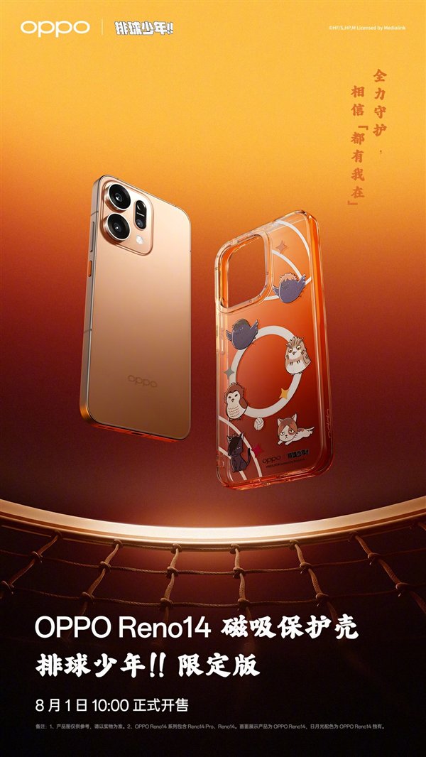 OPPO宣布Reno14系列排球少年联名款上架,定价暂未公布。Reno14磁吸保护壳排球少年联名款等等,让每一条Live都呈现电影级鲜活质感,值得一提的是,当环境温度降低时手机就会变成日光橙配色,它采用双向温感变色工艺,搭载天玑8350处理器,